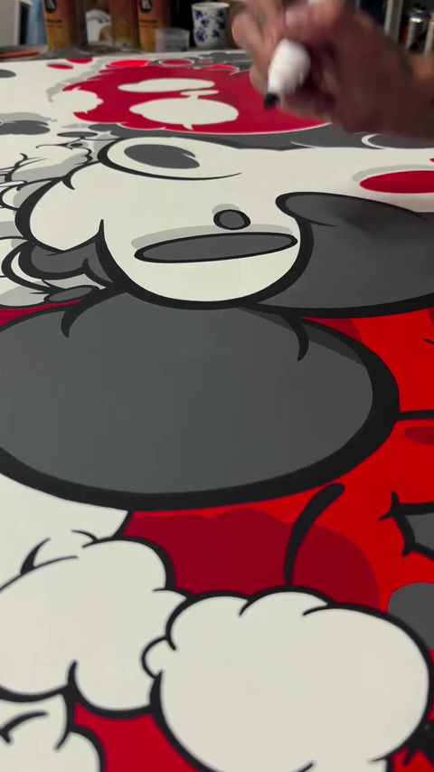 OPAKE is a prominent London-based artist whose work merges graffiti, pop art, and personal reflection. He reimagines iconic cartoon characters like Mickey Mouse and Pink Panther in ways that delve into deeper themes of mental health, addiction, and the breakdown of pop culture. His unique style, which he calls ''the disintegration of pop culture," often features bold colors and overlapping imagery that create a chaotic yet captivating visual experience.